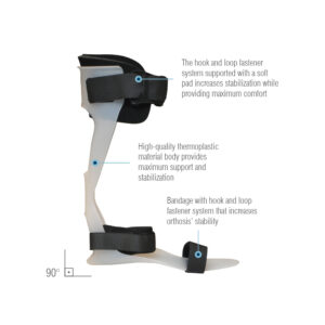 Δυναμικός νάρθηκας έσω υποδήματος κατασκευασμένος από θερμοπλαστικό υλικό. Παρέχει υποστήριξη στατικής ραχιαίας κάμψης και πλευρική σταθερότητα για ολόκληρη την περιοχή του αστραγάλου/ποδιού. Παρέχει εύκολη χρήση με ιμάντες velcro που περνούν γύρω από τον αστράγαλο. Χρησιμοποιήστε ένα ψαλίδι για να κόψετε την εσωτερική σόλα για να εφαρμόσετε με ακρίβεια στο παπούτσι. Μπορεί να τροποποιηθεί με θερμικό πιστόλι.