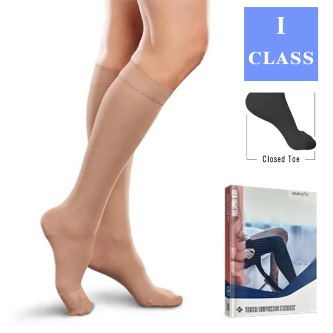 Οι Κάλτσες διαβαθμισμένης συμπίεσης Aurafix με το παγκόσμιας κλάσης επίπεδο ποιότητας συμπίεσης και πλέξης αποτελούν μια άνετη και υψηλής απόδοσης λύση.Η ανάγκη για κάλτσες συμπίεσης, με την ποιότητα και την ανθεκτική ύφανσή τους προσδίδουν την καταλυλότερη λύση.Οι Κάλτσες διαβαθμισμένης συμπίεσης Aurafix έχουν σχεδιαστεί σύμφωνα με το πρότυπο “TS ENV 12718 Κάλτσες συμπίεσης”. Διατίθενται μοντέλα με συμπίεση CCL1 (18-21 mmHg), CCL2 (23-32 mmHg), CCL3 (34-46 mmHg), CCL4 (49 mmHg και άνω) που χωρίζονται σε τύπους με ανοιχτά ή κλειστά δάχτυλα. Οι πρώτες ύλες που χρησιμοποιούνται είναι πιστοποιημένες κατά Oeko-Tex 100 και ελαχιστοποιούν τις αλλεργικές αντιδράσεις που μπορεί να εμφανιστούν στο δέρμα.